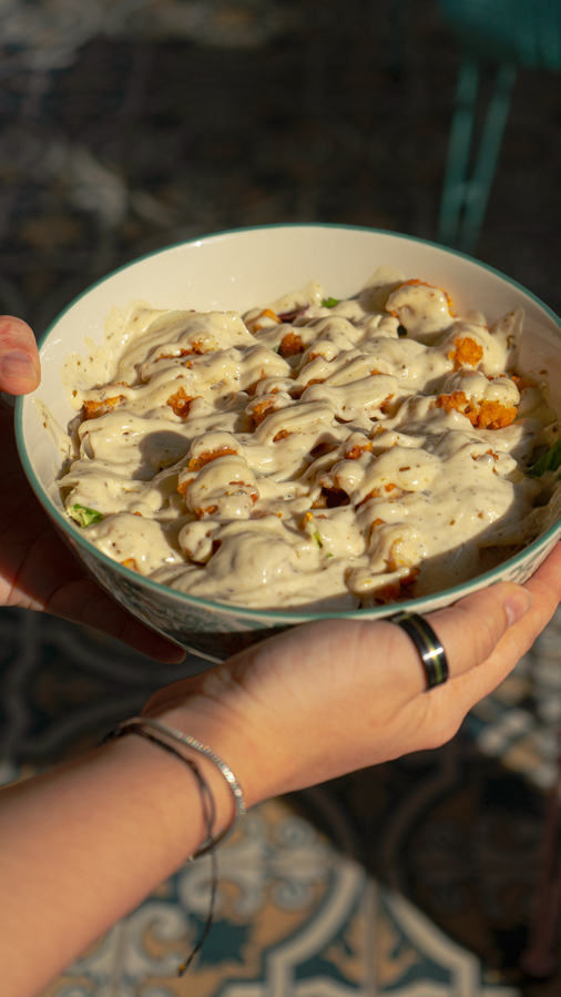 • Mezcla de lechugas, pollo crujiente, lascas de parmesano, picatostes y salsa césar.