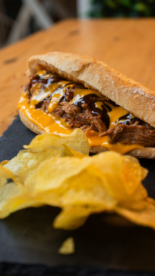 • Nachos pulled pork con queso cheddar, guacamole y pico de gallo